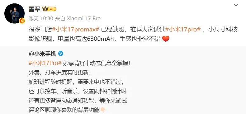 小米创办人、董事长兼 CEO 雷军也发文表示:“很多门店小米 17 Pro Max 已经缺货,推荐大家试试小米 17 Pro,手感也非常不错。”