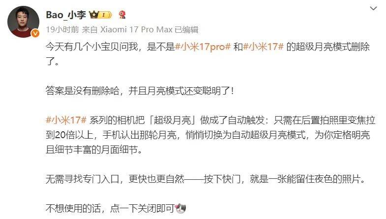 此外,他还回应了“是不是小米 17 Pro 和小米 17 的超级月亮模式删除了”这一问题。