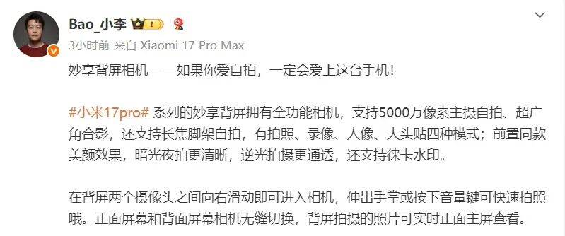 “小米17 Pro系列的妙享背屏拥有全功能相机,支持5000万像素主摄、超广角合影,还支持长焦脚架,有拍照、录像、人像、大头贴四种模式;前置同款美颜效果,暗光夜拍更清晰,逆光拍摄更通透,还支持徕卡水印。